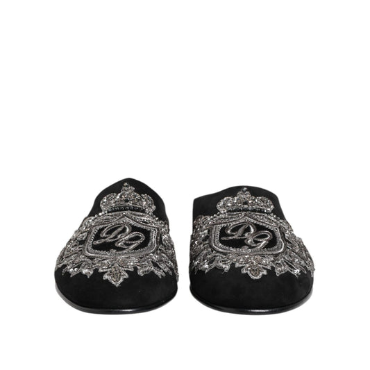 Dolce & Gabbana Black Velvet Slides DG Crown Slipper Shoes