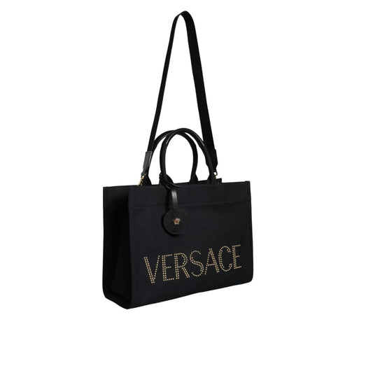 Versace Black Top Handle Canvas Leather Logo Crossbody Tote Bag