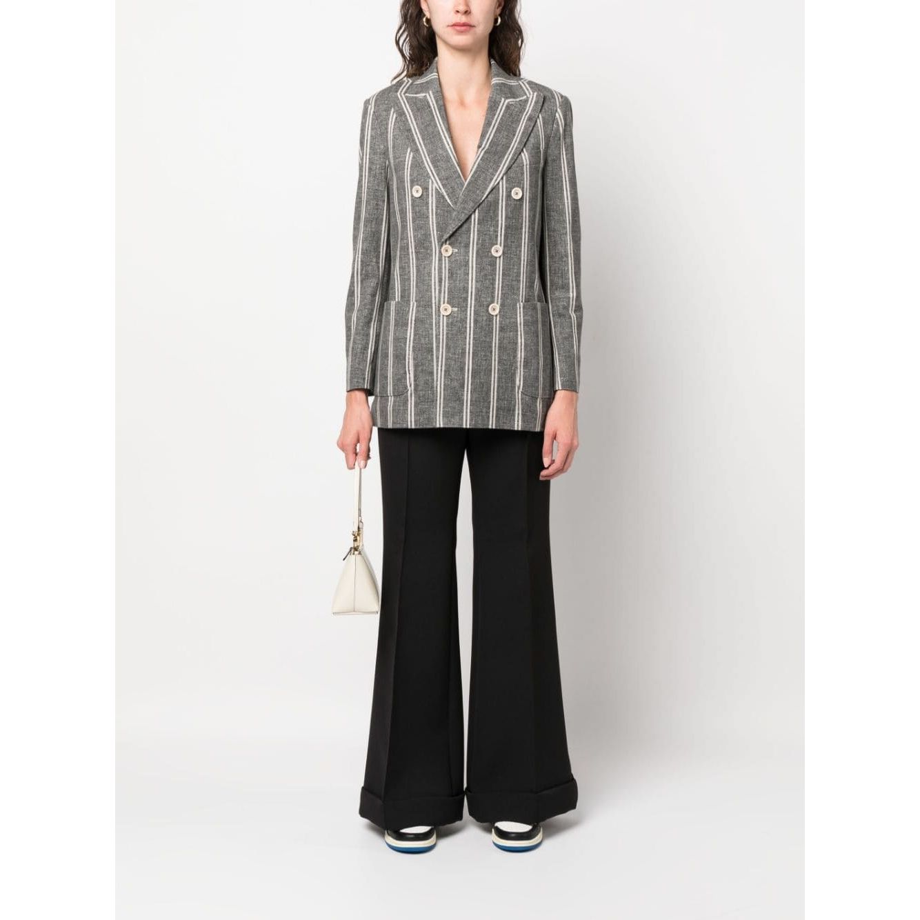 double-breasted striped blazer from CIRCOLO 1901 featuring dark grey, white, stretch-cotton, vertical stripe pattern, notched lapels, double-breasted button fastening, long sleeves, buttoned cuffs, chest welt pocket and two front patch pockets. Striped double-breasted jacket Size and Fit - This piece fits true to size. We recommend you get your regular size. Model is 1,75m / 5ft 8in wearing size 40 (IT)