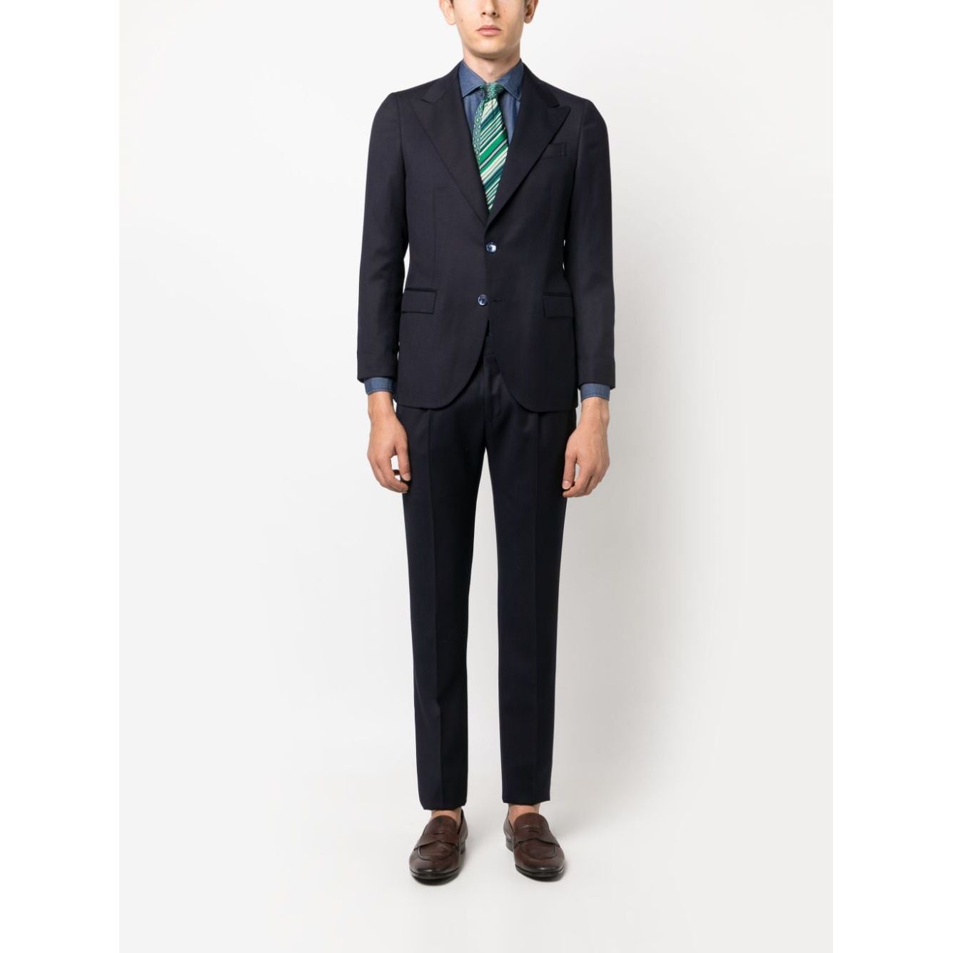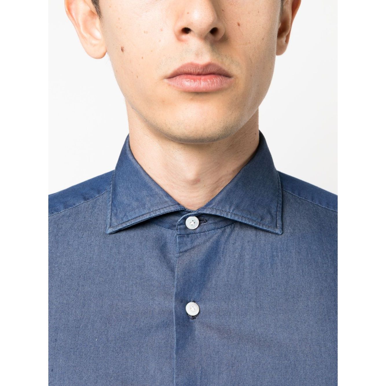 navy blue cotton spread collar front button fastening long sleeves buttoned cuffs rear curved hem Napoli cotton shirt Size and Fit - This piece fits true to size. We recommend you get your regular size. Model is 1,84m / 6ft 1in wearing size 39 (COLLAR CM)
