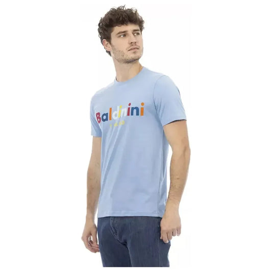 优雅蓝色棉质 T 恤,正面有时尚印花