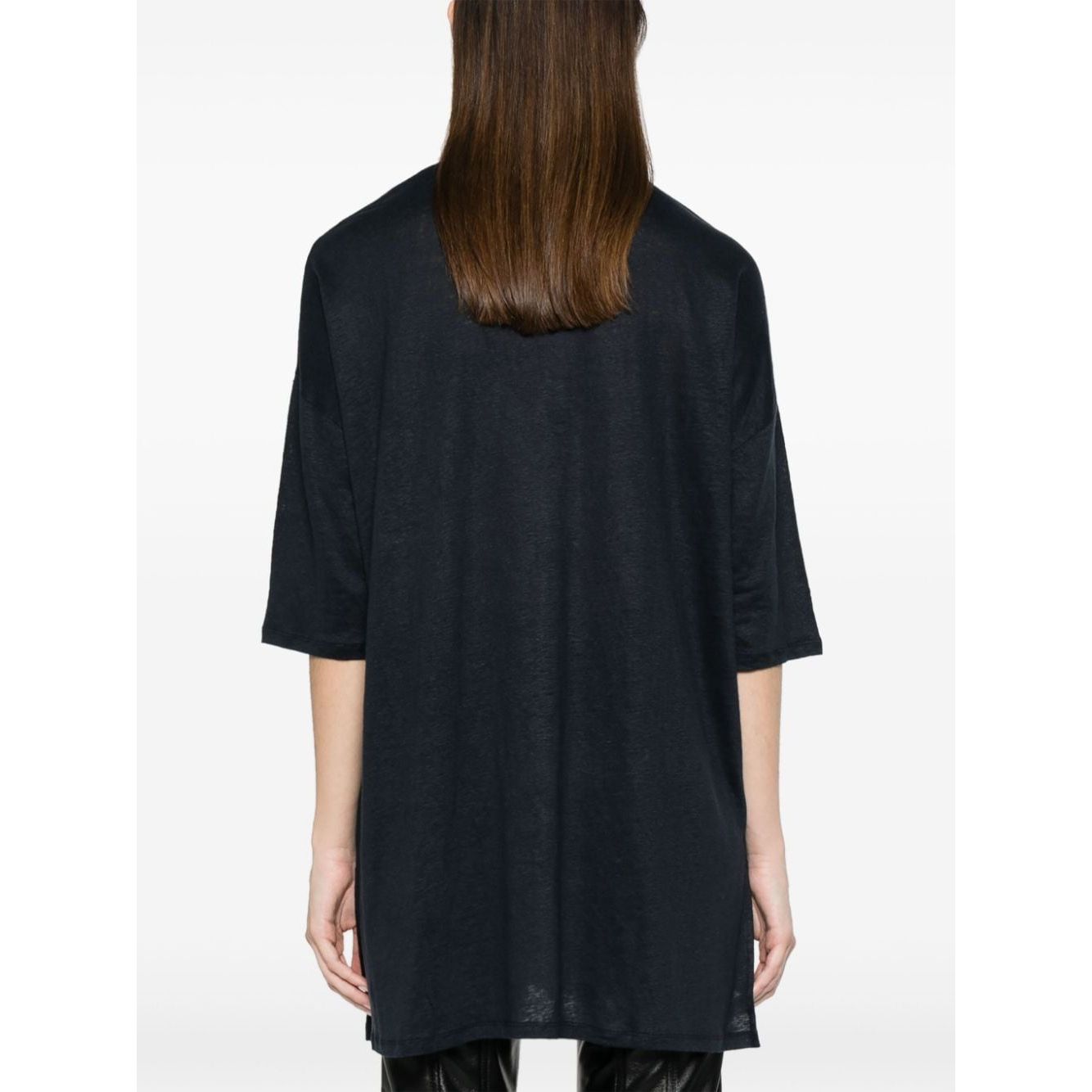 navy blue linen blend stretch-design slub texture V-neck three-quarter length sleeves side slits straight hem This item contains at least 50% materials which are certified or widely recognised as having a lower environmental impact through production and/or manufacturing processes that reduce water consumption and the use of harmful chemicals, or re-use by-products of the production process. Learn more about what makes a product Conscious on our Conscious Criteria page Linen blend tunic dress Size and Fit - This piece fits true to size. We recommend you get your regular size. Model is 1,75m / 5ft 8in wearing size 1 (NUM)